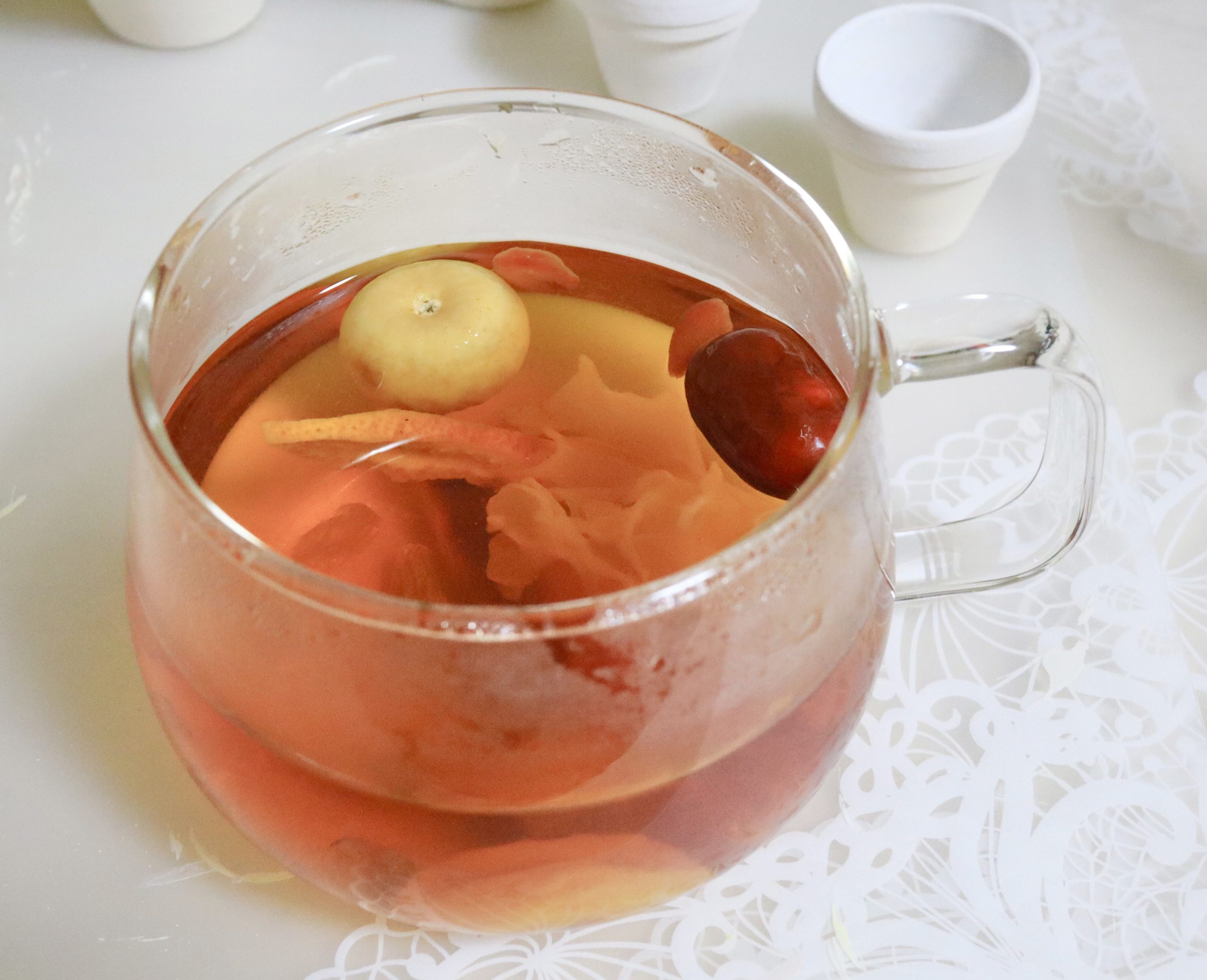 入っているドライフルーツは、ナツメ、葡萄干、白キクラゲ、クコ、いちじく、陳皮、あんず、氷砂糖、トマト、サンザシ、です。
