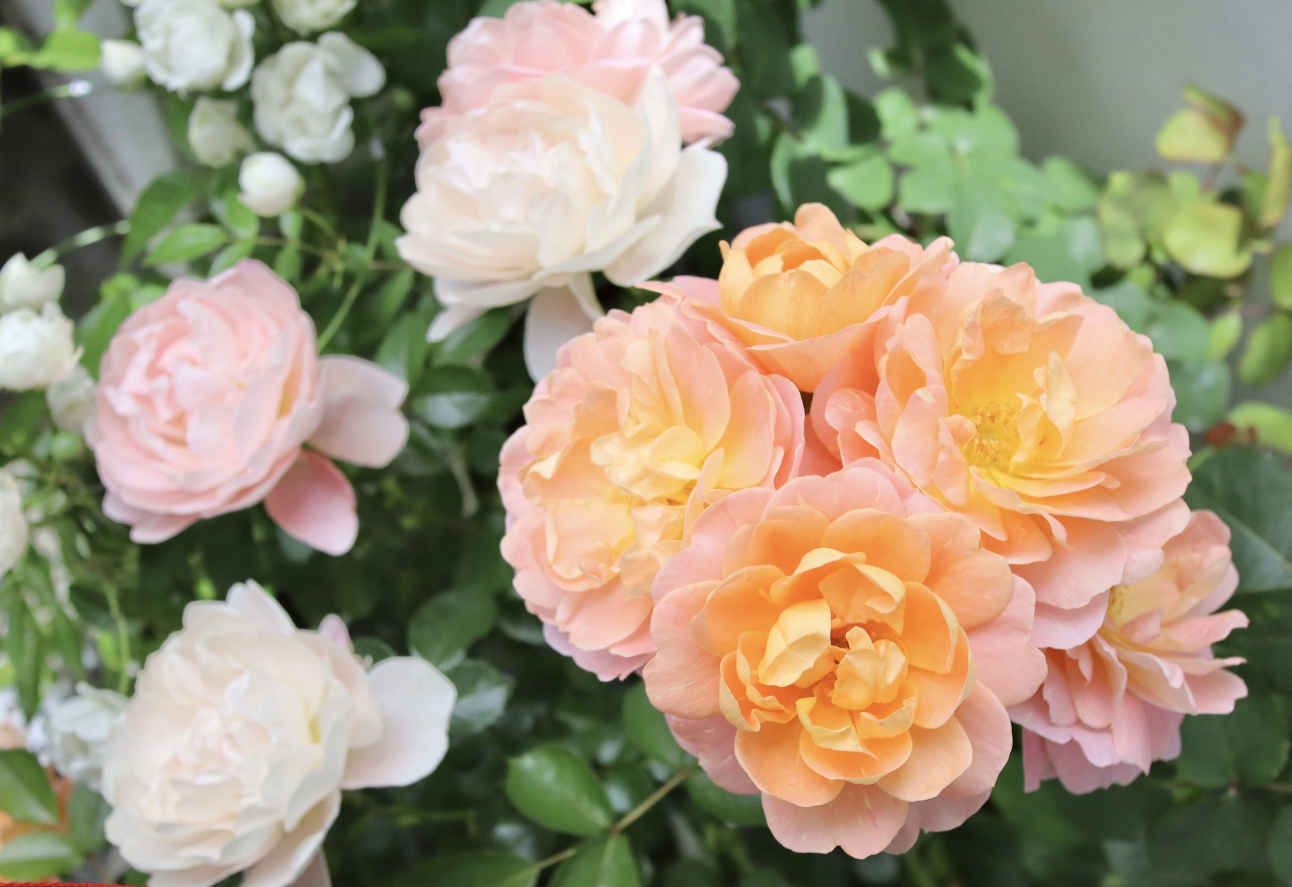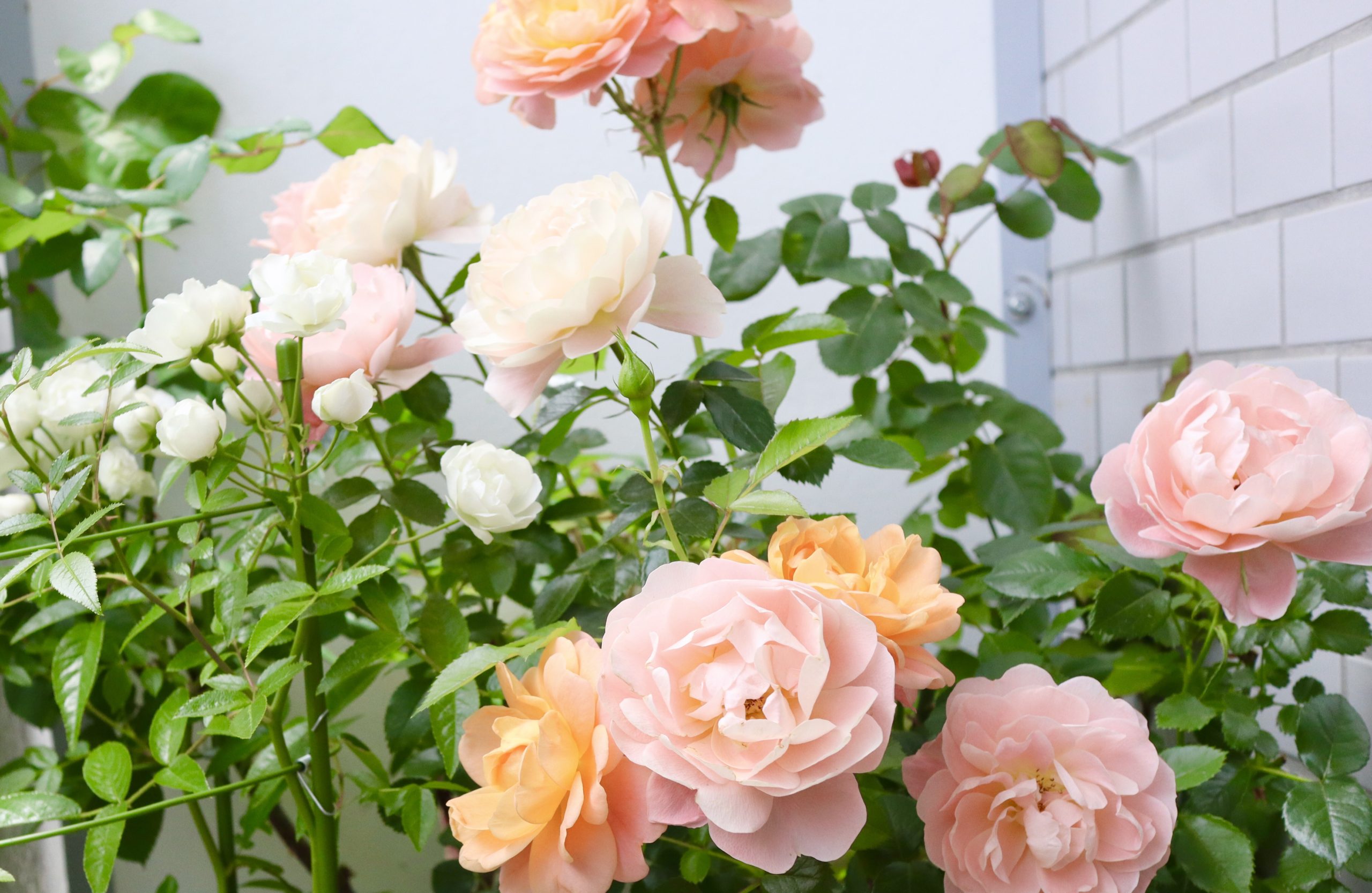このラックのおかげで薔薇たちのスペースも広くなり、何鉢かあるうちの4つの薔薇をみんな色が違うのでまとめたら綺麗かなと思って1箇所に4つの鉢をまとめてみました。