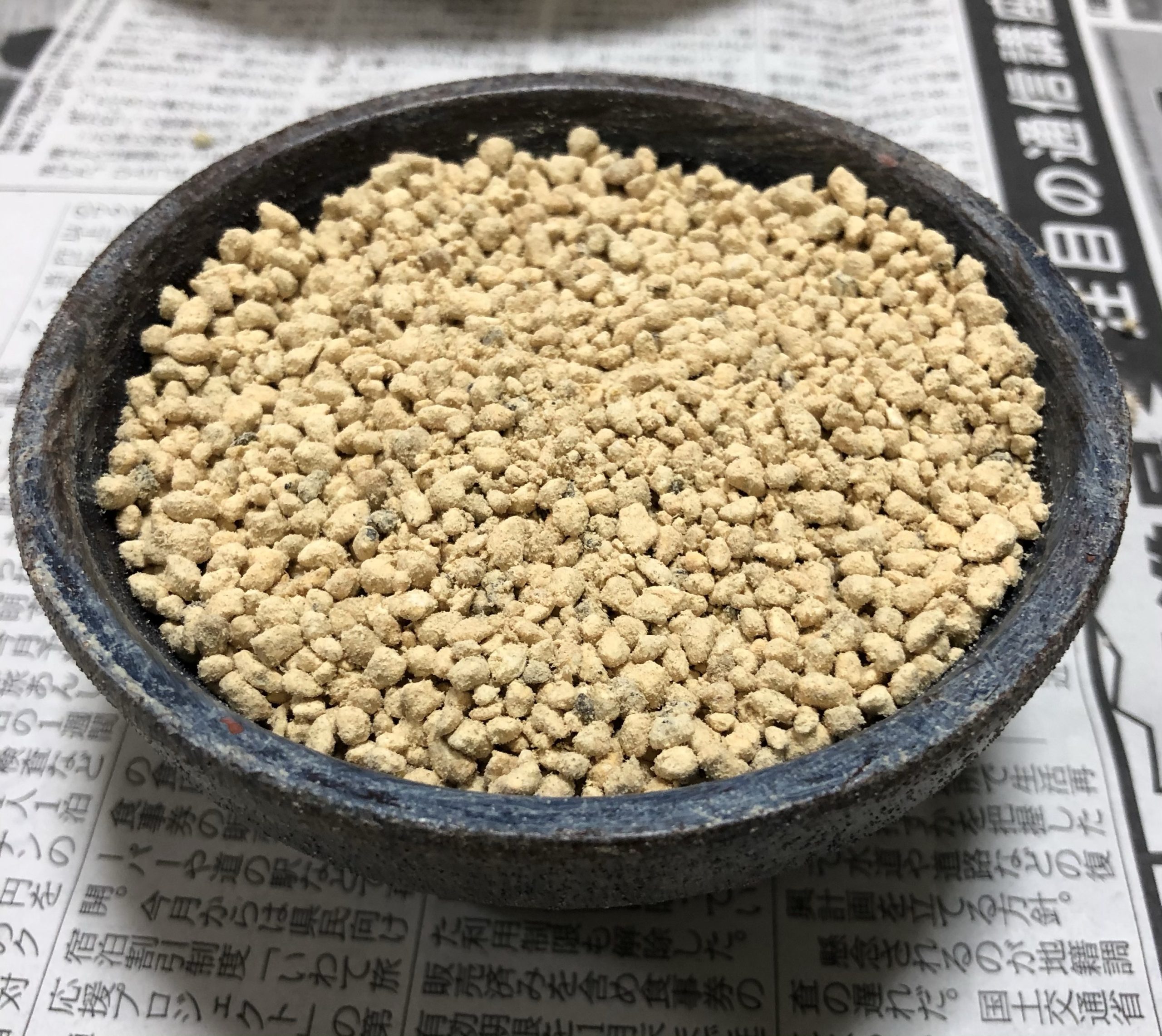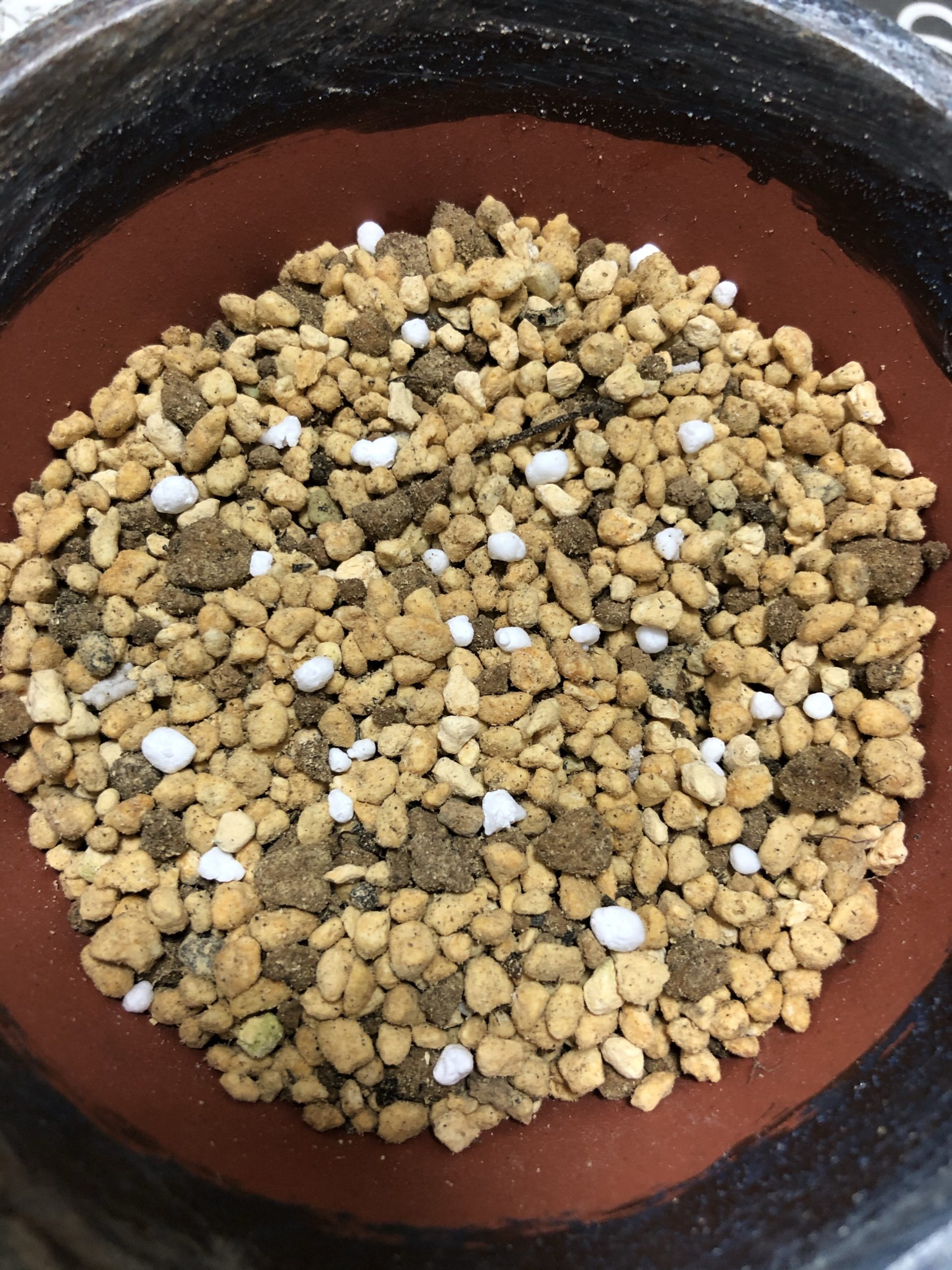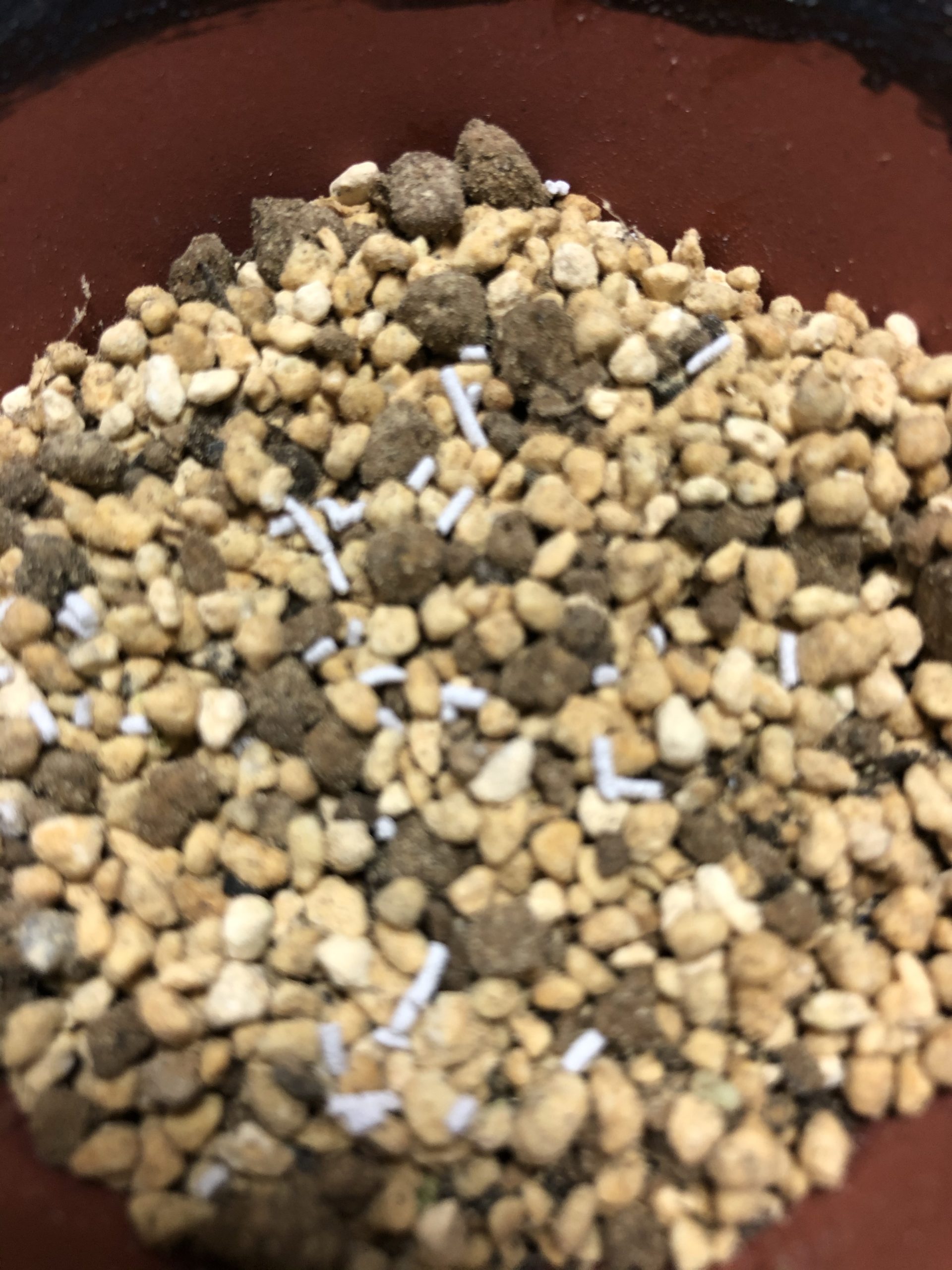 そして赤玉土と鹿沼土の混合をさらに入れて、これくらいになったら次はマグァンプを数粒まきます↓