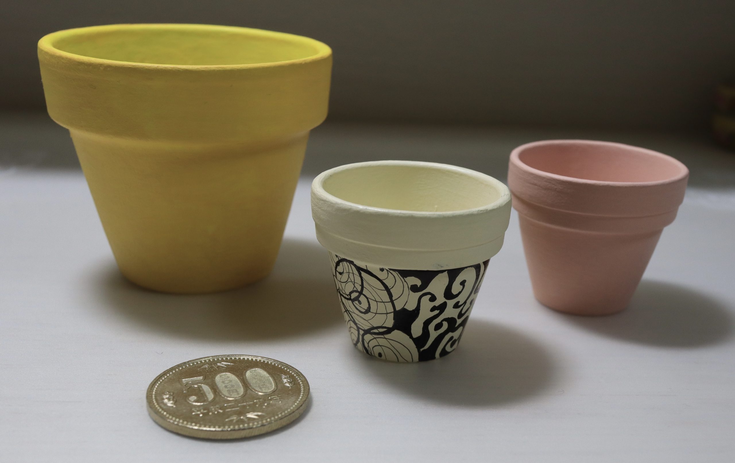 さて、ミニ鉢はその後どこまで進んでるいるかというと、なかなか下地の色が隠れなくて、何度も何度も塗りと乾燥を繰り返してようやく終わりました。