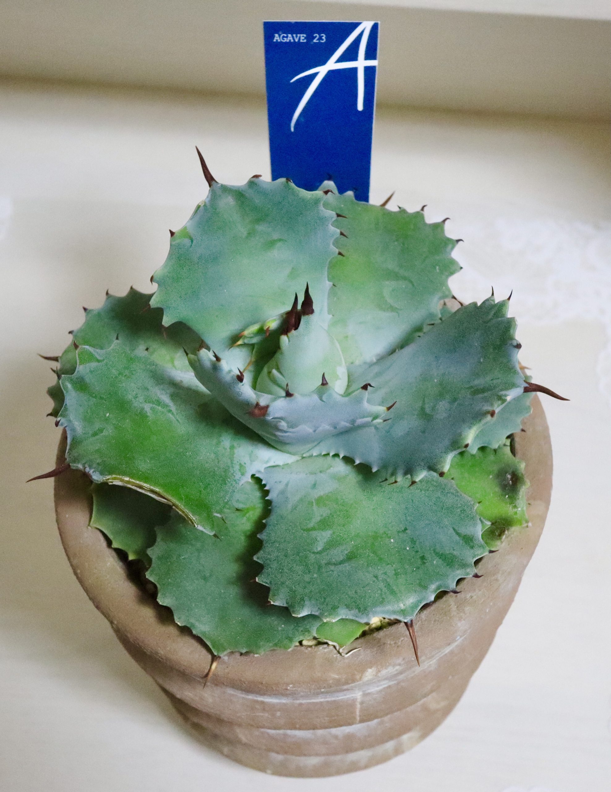 これはアガベのイシスメンシスという品種で曲がった爪と肉厚な葉に爪の模様が残っているのが魅力です。