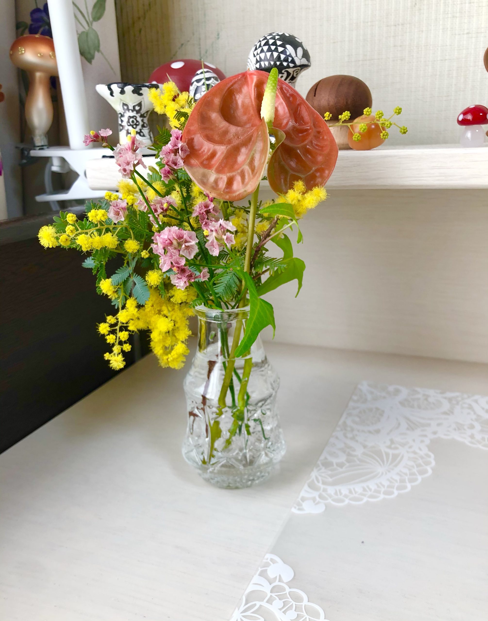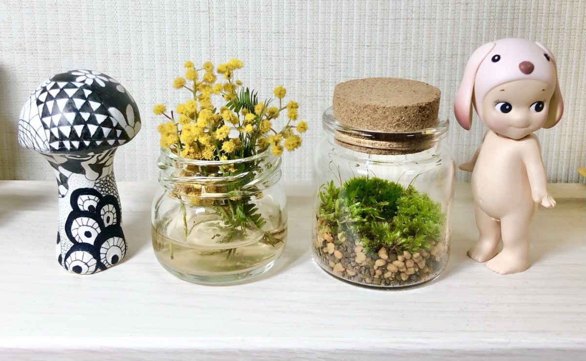 左のミモザは、この前投稿したジャムの空き瓶です。ジャムを買った時、瓶が可愛かったってのもあります。笑