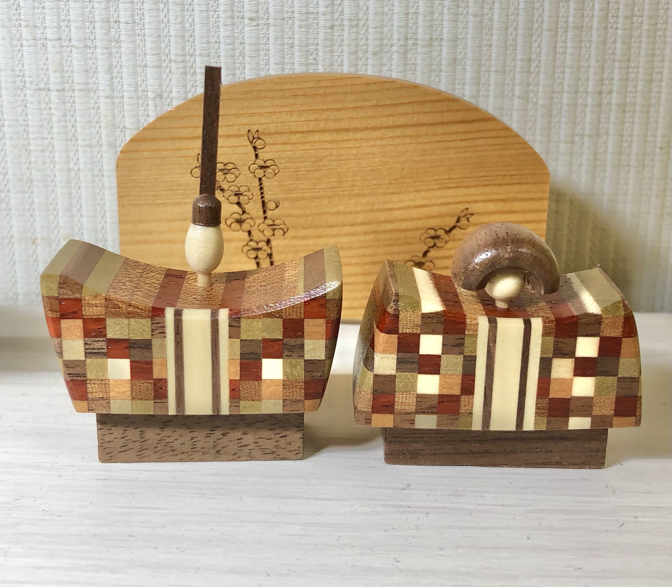 と言っても何段飾りとかでもなく、小さな寄せ木の雛人形です。