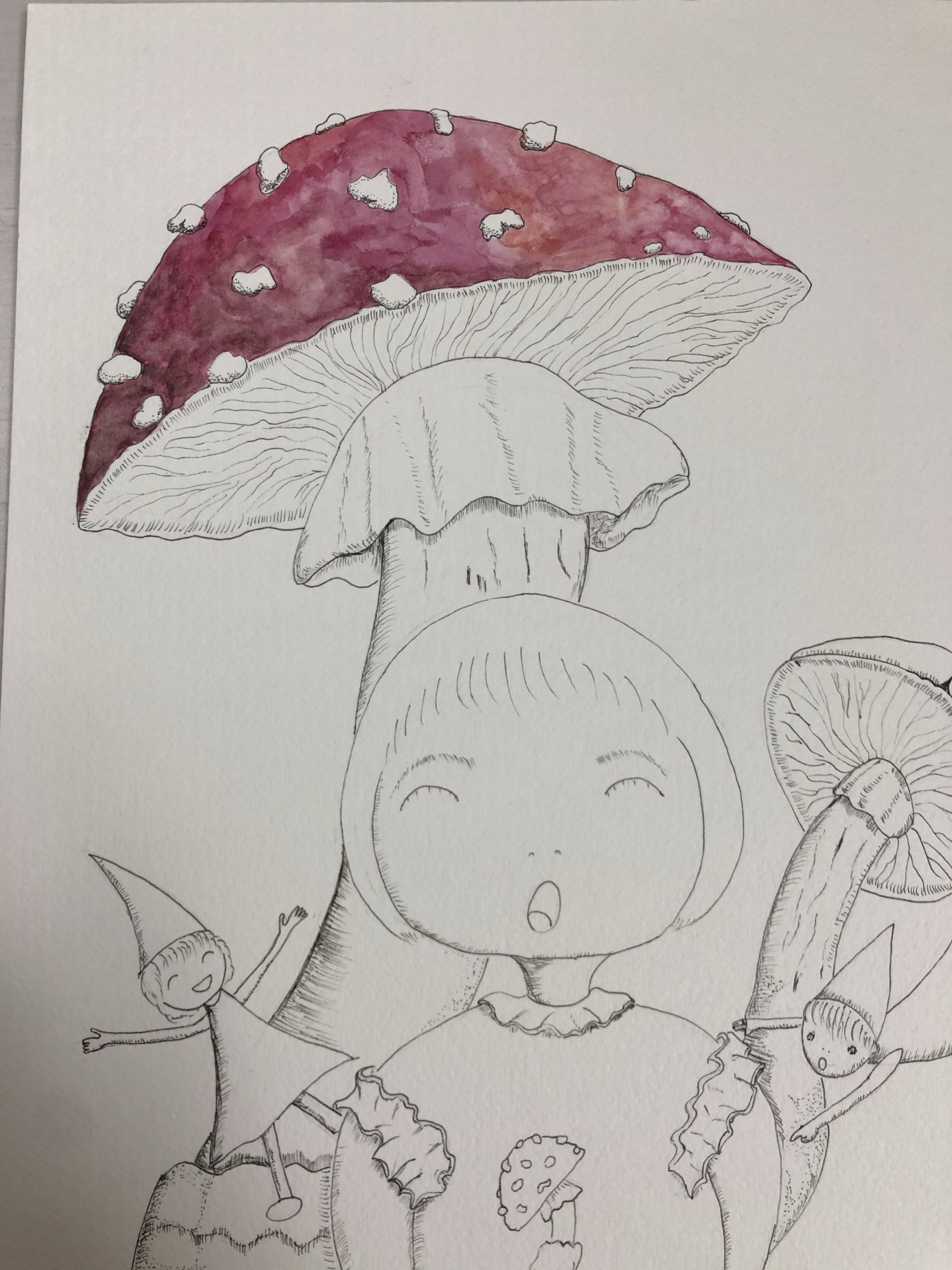 この絵の場合は、頭の中で少しグロテスクなキノコにしたかったから、そこから色をつけ始めました。
