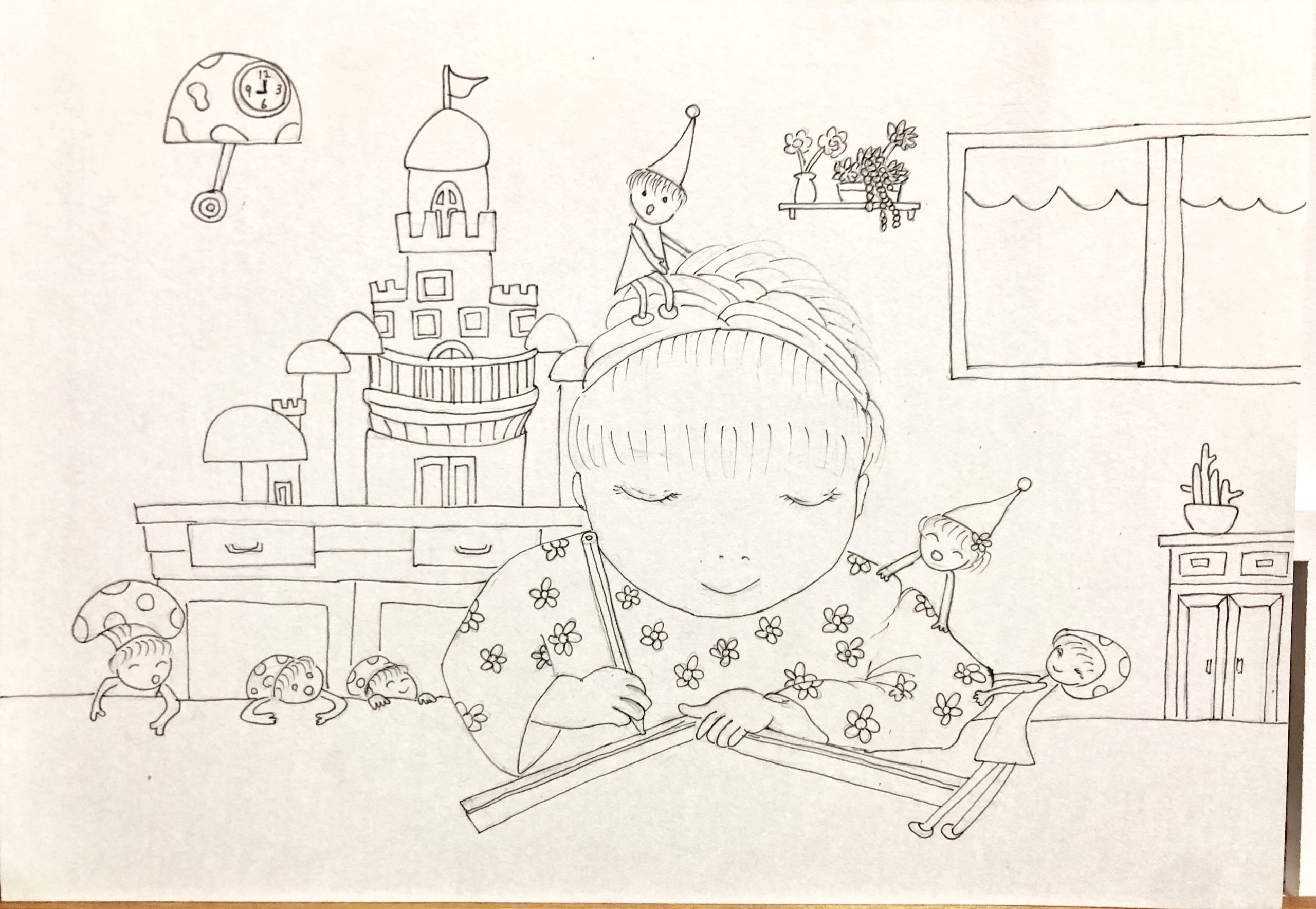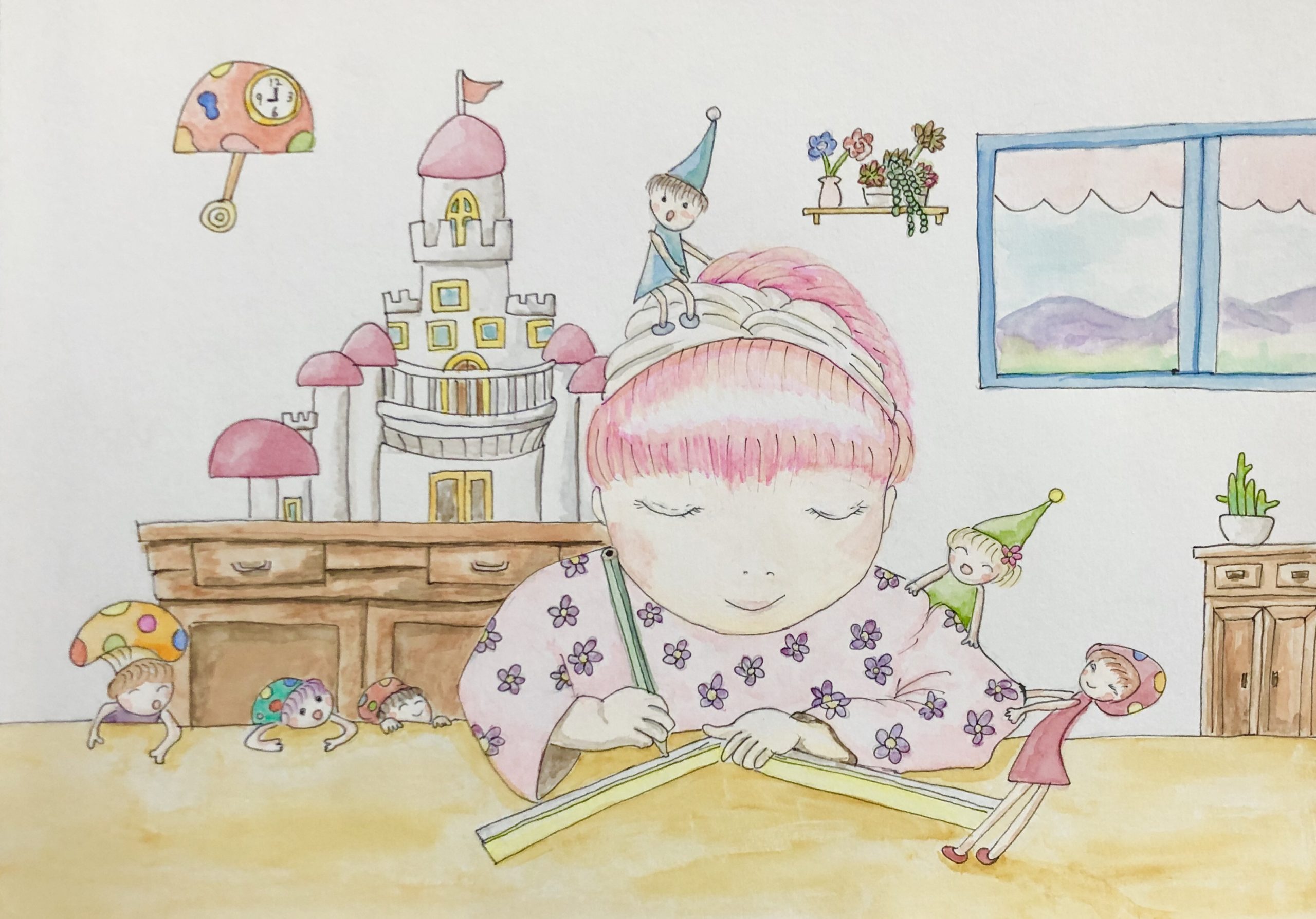女の子が絵を描いていて、遊んでほしい妖精たちが、なんとか女の子の気を引こうとしているところ?..です。笑
